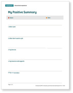 The positive summary offers an at-a-glance look at key discoveries from the plan phase that can support a person-centered job search. The positive summary should be completed with the person when they're ready to move on to the find phase.
