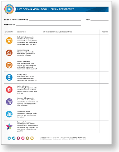 The Charting the LifeCourse tools help families think about their child's life and become partners in the transition process. Take time to discover a family's thoughts about their child, their vision for their child's life, and the resources and supports they believe their child needs.