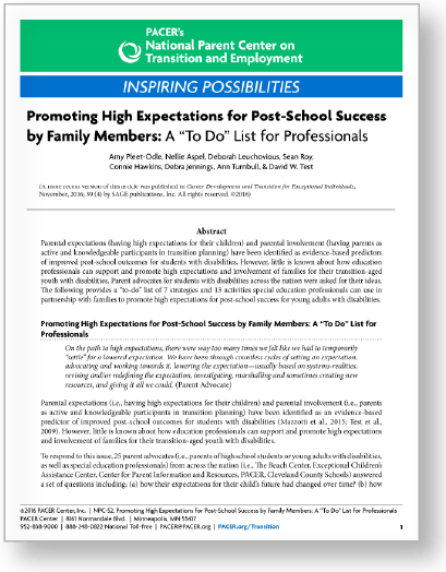 High parental expectations and active parental involvement in transition planning are key indicators of positive post-school outcomes. Communicate and model high expectations for the youth you support, and encourage families to do the same.
