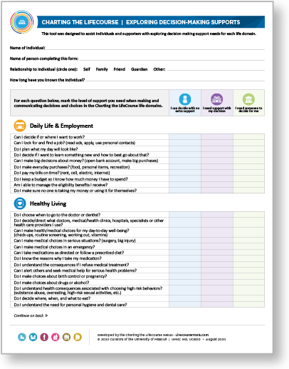 Use Charting the LifeCourse's supported decision making material to explore areas were youth might need decision making support, plan for what it looks like and how it can happen, and find the needed supports.