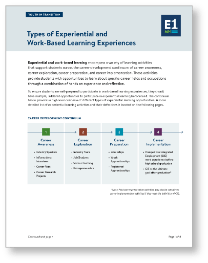 There are a variety of experiential and work-based learning experiences, including awareness, exploration, preparation and implementation. Learn about the types in this work-based learning experiences guide (PDF).
