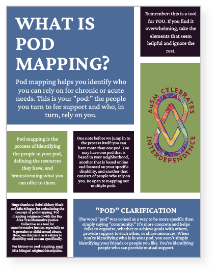 Everyone needs to rely on others for help in their daily lives sometimes. Knowing who to go to for support can help people self-advocate and get their needs met. Pod mapping is a practice that helps someone identify who they can lean on when they need help. Read this introduction to pods and pod mapping from the SOIL Transformative Justice Collective to learn more about how this practice can be used.
