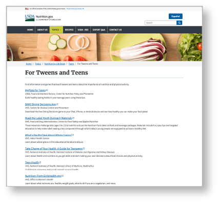 Check out For tweens and teens from the U.S. Department of Agriculture for information and games that teach tweens and teens about the importance of nutrition and physical activity.