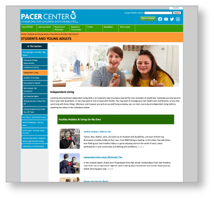 Within the Disability Justice movement, the term “interdependence” refers to the way that every person relies on their community for care and support, and gives that care and support to others, too. Part of transition planning involves identifying skills where the youth wishes to build their independence and areas where they’d like to tap into their community and other supports. The blended term “in(ter)dependence” reflects the many different ways that a youth can plan for managing their adult life within their community.