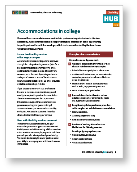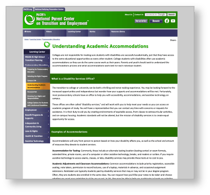 Accommodations and assistive technology in postsecondary education and training provide students with disabilities an equal opportunity to participate in academic programs. They help students with disabilities become more efficient and independent by performing functions that may otherwise be difficult or impossible. Accommodations may include modifications or adjustments to specific tasks, the classroom environment or the way things are usually done as well as use of assistive technology.