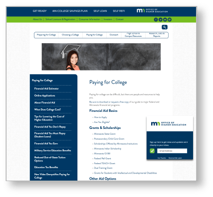 Paying for college from the Minnesota Office of Higher Education provides an introduction to financial aid, including a financial aid estimator and tips to lower the cost of postsecondary education.