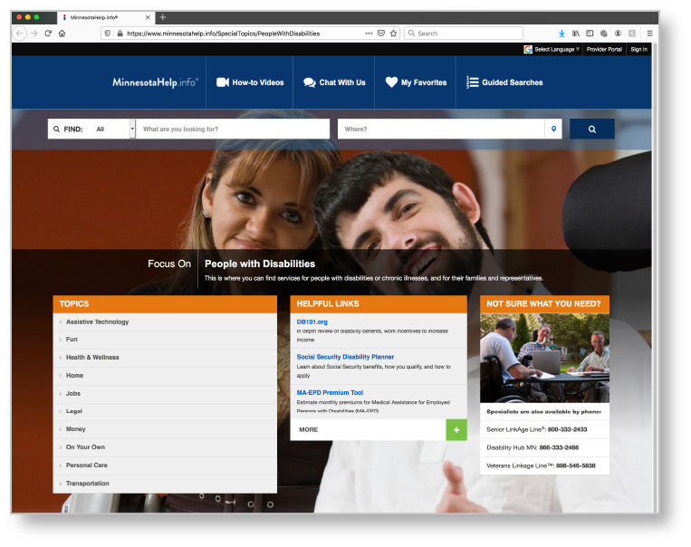 MinnesotaHelp.info can help you find the community services you need to live your best life. You can search for services by keyword or browse popular topics. MinnesotaHelp.info provides details about more than 12,000 service providers offering services at more than 27,000 locations across the state.