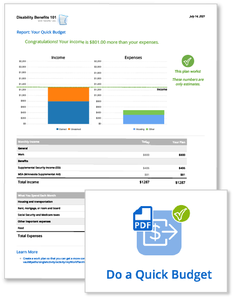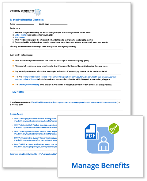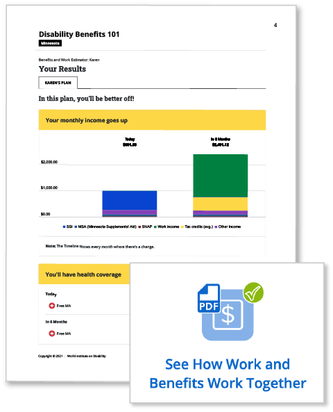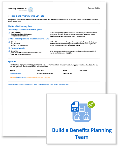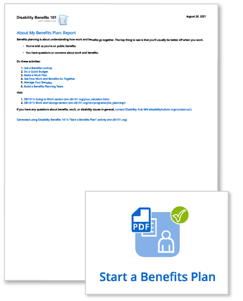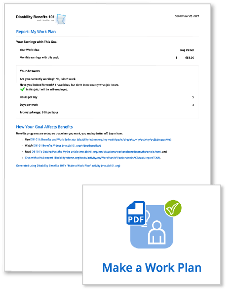 Once you’ve finished the Benefits Planning activities that make sense for you, you’ll have a full Benefits Planning report that includes the PDFs from each activity you’ve completed. You can look at your report to see all of your activities in one place, and review your results as you plan for work. You can also share your report with others so they can see your goals and help you plan.