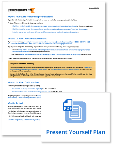 This activity helps you find strategies to get past problems you may have had that make getting housing difficult. It walks through strategies for people who have a criminal record, rental history problems, and credit problems. - Presenting Myself