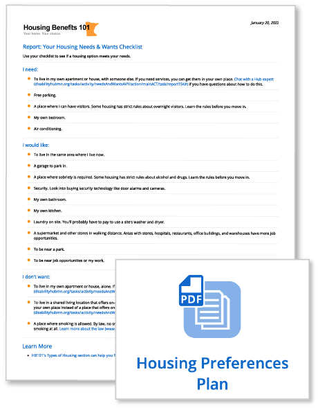 In this activity you will think about where you live now and set goals for your future housing by answering questions about your preferred living arrangements. - Build a Housing Team